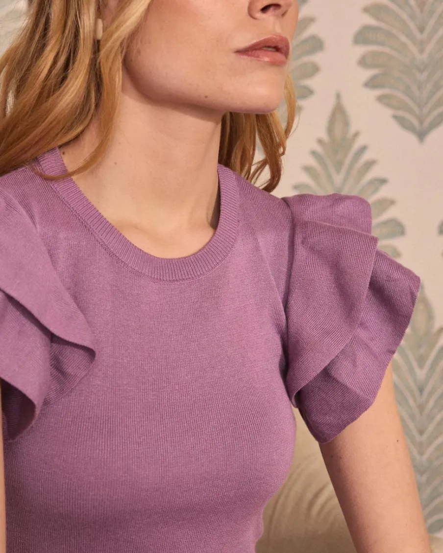 Haut en maille avec une coupe ajustée et un ton lilas délicat. Son design se distingue par des manches à volants structurées, apportant une touche féminine et sophistiquée.