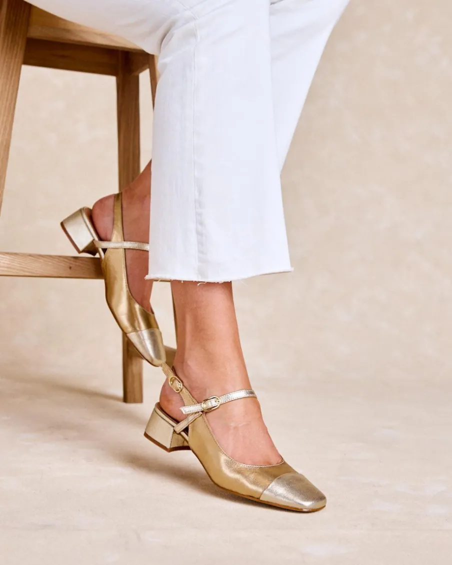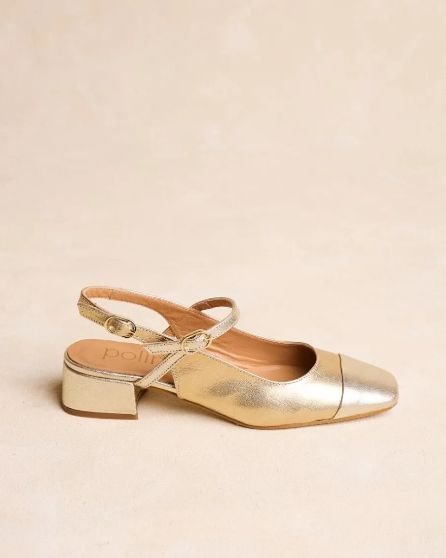Escarpins dorés Mary Jane. Fermeture par sangle réglable avec boucles. Bout légèrement carré. Encolure arrondie. Une chaussure stylée et élégante pour un usage quotidien.