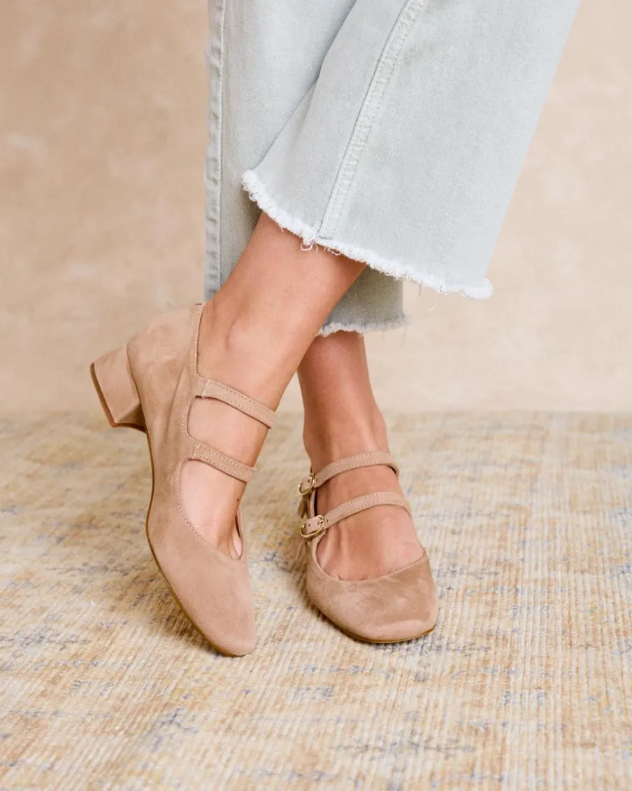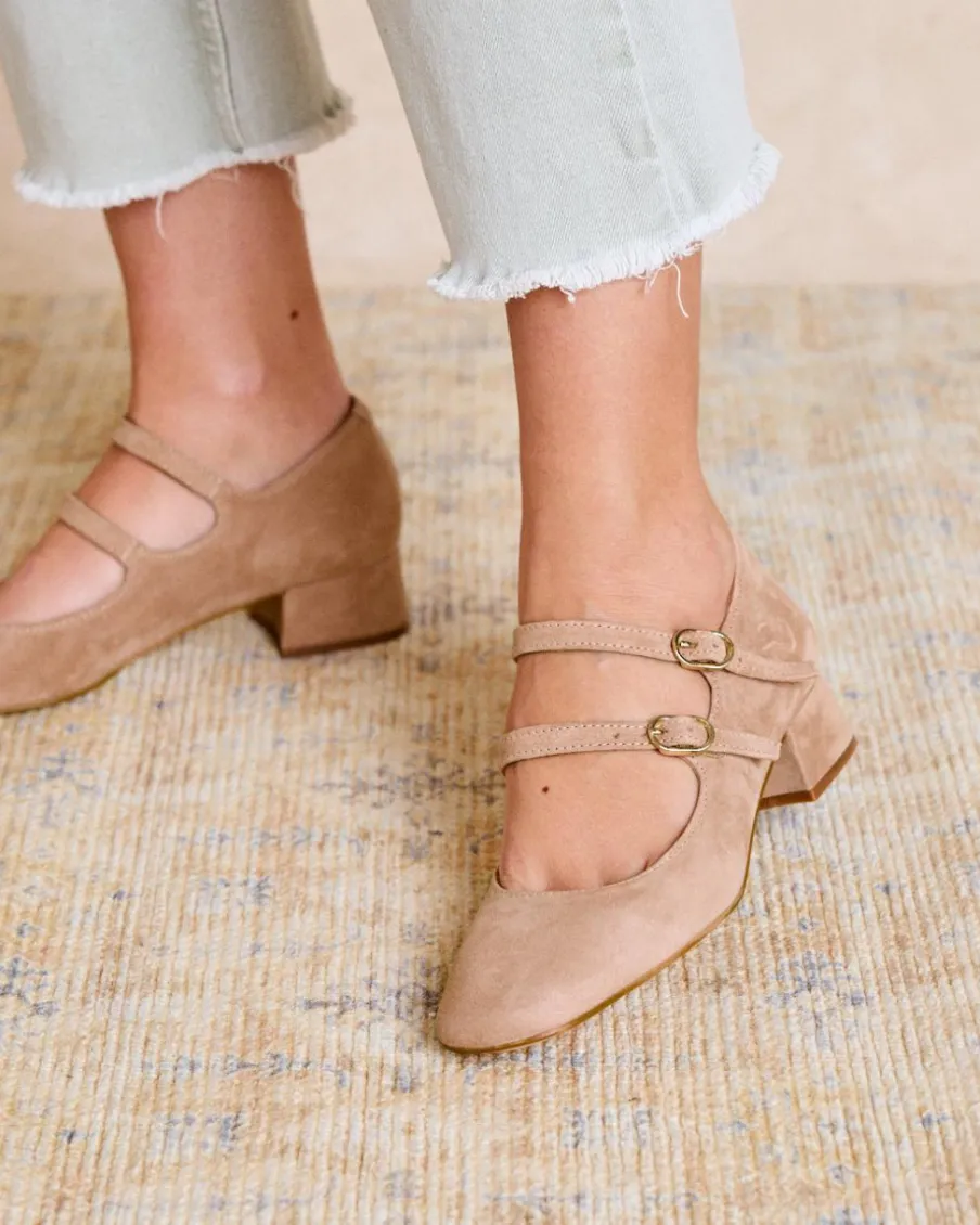 Ballerines en cuir velours de couleur nude. Fermeture par double sangle réglable avec boucles. Bout légèrement carré. Encolure arrondie. Un ballerines élégant et confortable à porter au quotidien.