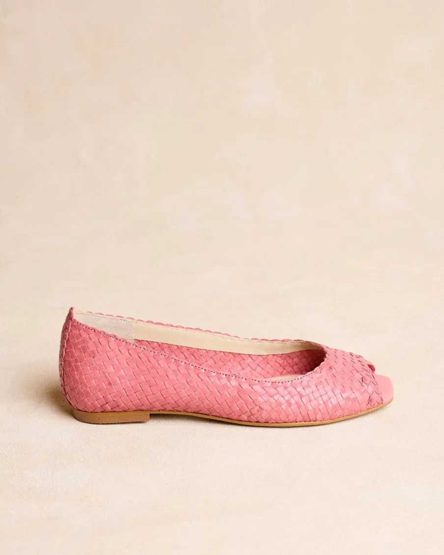 Ballerines en rose, avec des détails tressés. Bout ouvert arrondi. Encolure arrondie. Une chaussure très féminine et confortable pour créer des looks.