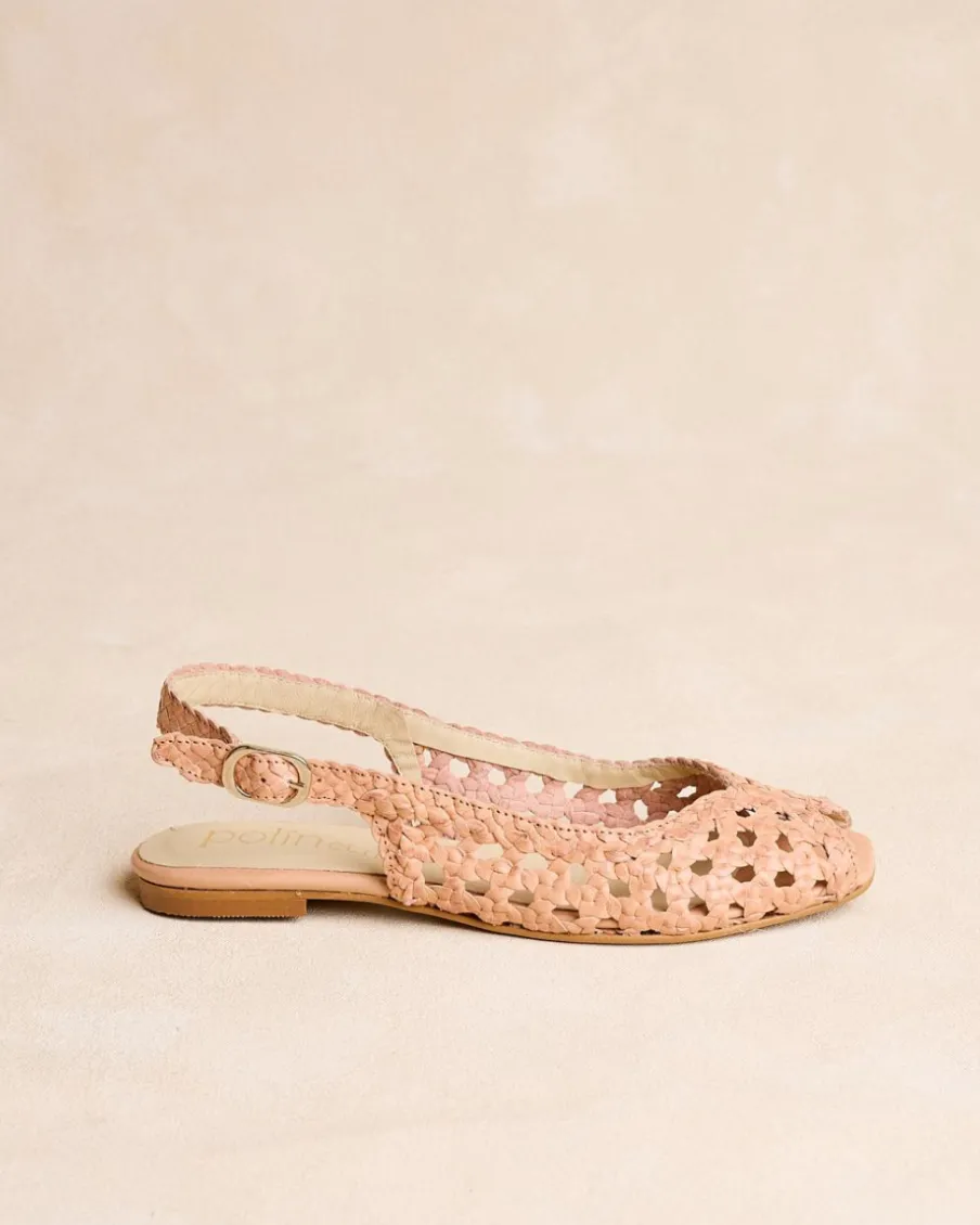 Chaussure plate en cuir tressé de couleur sable. Encolure papillon. Modèle à bride arrière avec bride en cuir tressé avec boucle pour un meilleur ajustement. Une chaussure confortable et très féminine à porter au quotidien.